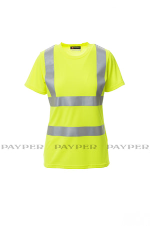 T-shirts girocollo da donna, manica corta in alta visibilità con bande riflettenti, cuciture del collo coperte.