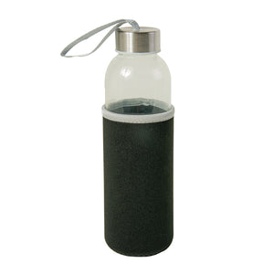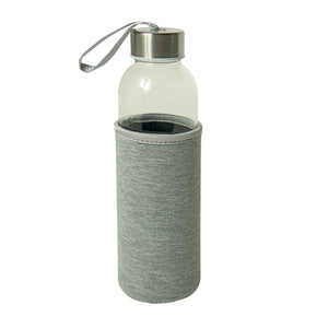Bottiglia in vetro con tappo in acciaio e custodia in neoprene.