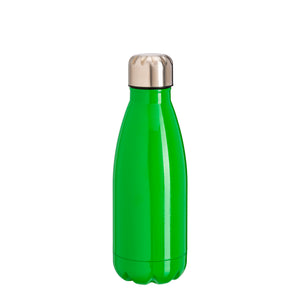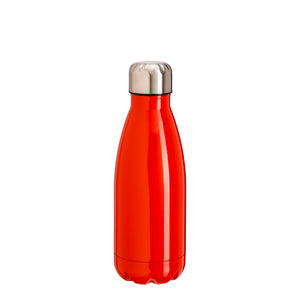 Bottiglia termica in acciaio inossidabile con doppia parete isolante che ne aumenta la capacità di isolamento e tappo in acciaio, capacità 350 ml. Mantiene la temperatura di bevande sia calde che fredde sino a 12 ore.