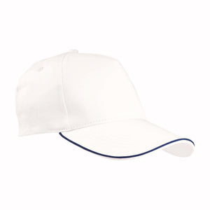 Cappellino in cotone, 5 pannelli visiera sandwich in contrasto con regolazione in metallo.