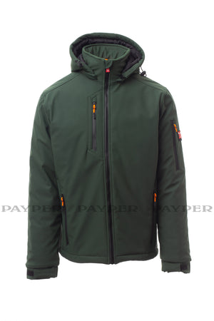 WP 8000 mm H₂O, WVT 5000 g/m² 24h. Soft-shell imbottito da uomo, chiusura tramite zip SBS con cursore in metallo "semi-auto lock" e tiretto personalizzato. Cappuccio removibile, con coulisse regolabile. Colletto interno con dettagli laterali in pile. Bande retroriflettenti su fondoschiena e retro cappuccio. Polsini elasticizzati, regolabili con velcro. Due tasche laterali con zip, una tasca al petto con zip spalmata e una tasca sul braccio sinistro con porta penne integrato, chiusa con zip. Tiretti fluorescenti. Una tasca a filetto interna, chiusa con velcro. Fondo regolabile con stopper personalizzati.