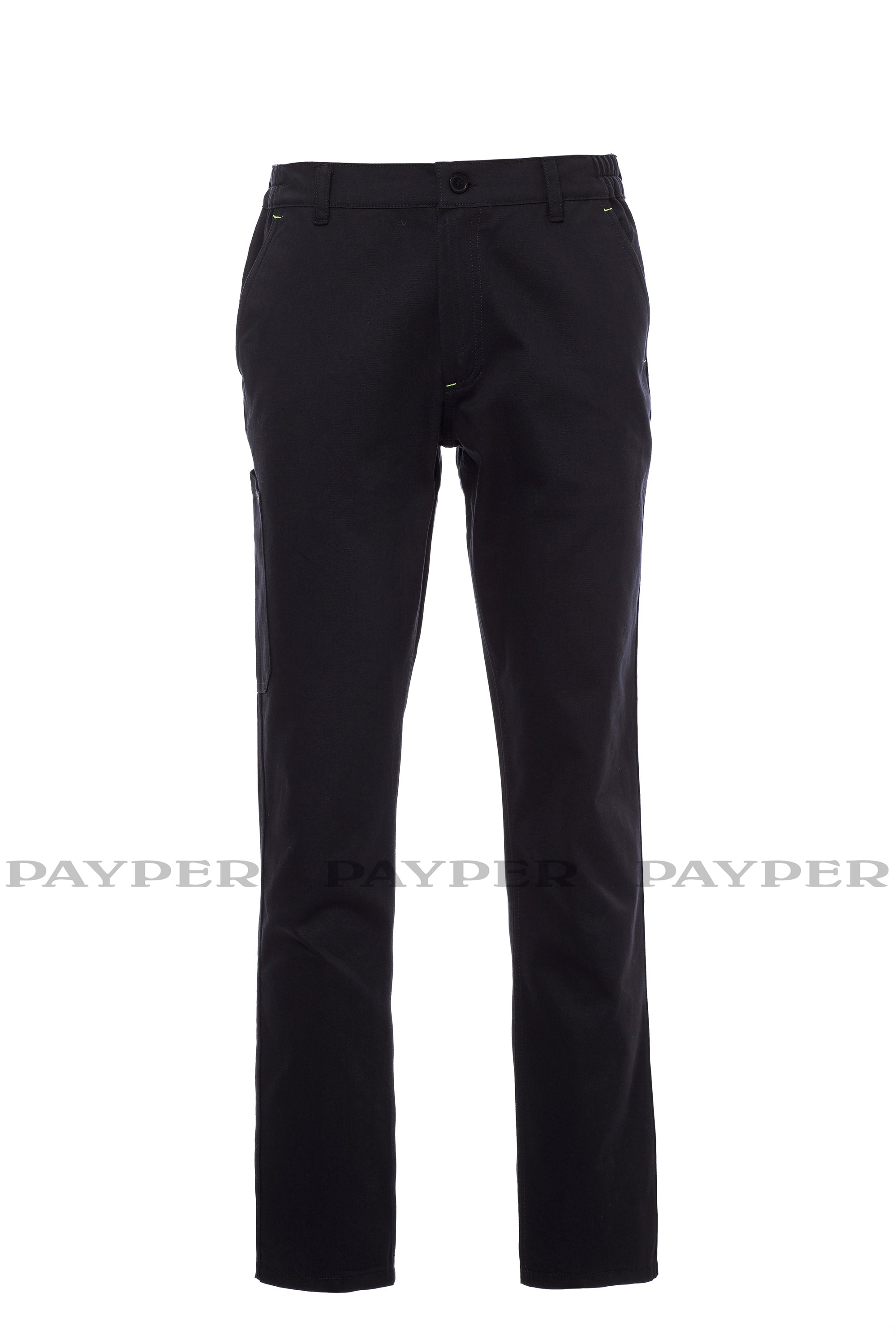 Pantalone con passanti ed elastico in vita, chiusura con zip e bottone. Due tasche anteriori a taglio classico, porta metro laterale dx, una tasca posteriore con patta e velcro. Cuciture tre volte fa.