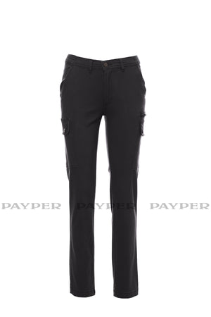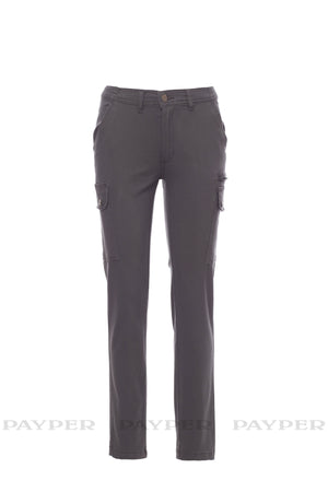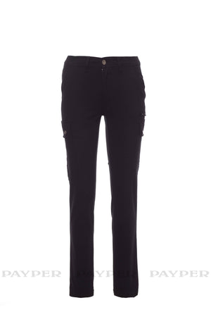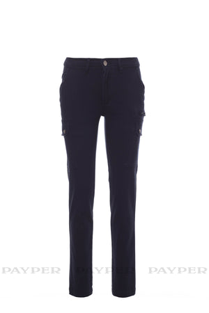 Pantalone donna, taglio classico, stretch, multistagione, elastici laterali e passanti in vita, chiusura con zip e bottone in metallo, due tasche anteriori a taglio classico, due tasche laterali con patta e bottoni automatici, una tasca con zip lato sinistro, un porta metro a scomparsa lato destro, due tasche posteriori a filo con asola e bottone.