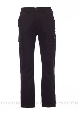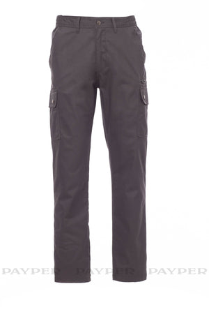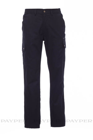 Pantalone uomo, invernale, foderato con flanella in poliestere (peso 110 g/m²), elastici laterali e passanti in vita, chiusura con zip e bottone in metallo, due tasche anteriori a taglio classico, due tasche laterali con patta e bottoni automatici, una tasca con zip lato sinistro, un porta metro a scomparsa lato destro, due tasche posteriori a filo con asola e bottone.