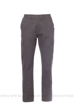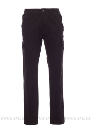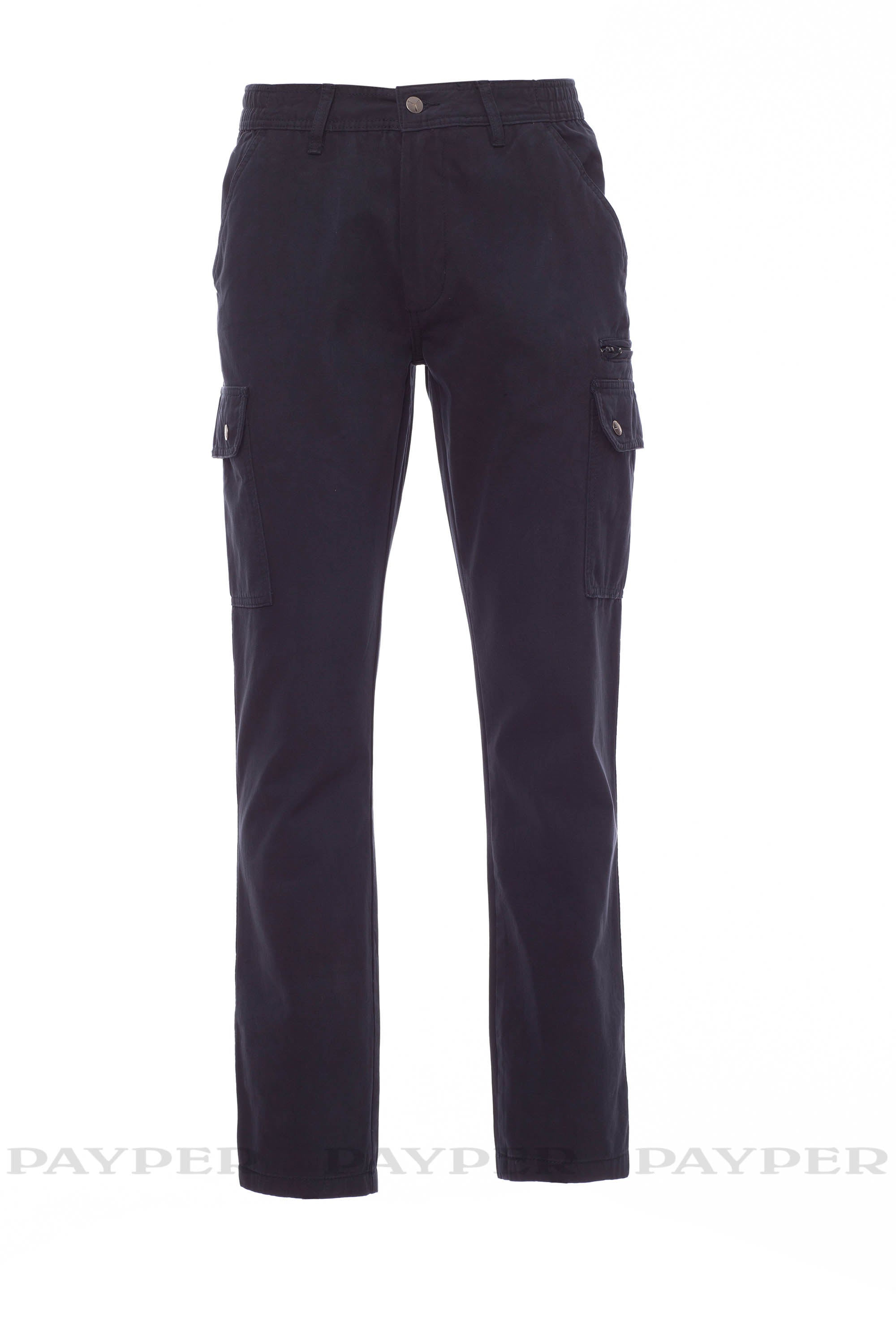 Pantalone uomo, invernale, elastici laterali e passanti in vita, chiusura con zip e bottone in metallo, due tasche anteriori a taglio classico, due tasche laterali con patta e bottoni automatici, una tasca con zip lato sinistro, un porta metro a scomparsa lato destro, due tasche posteriori a filo con asola e bottone.