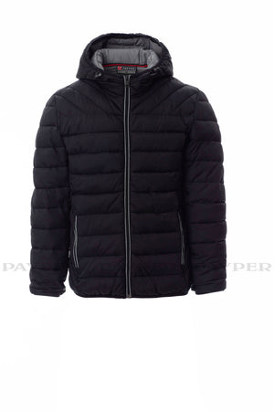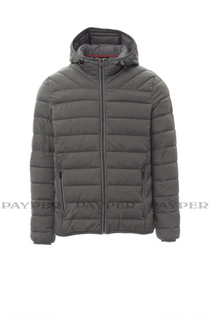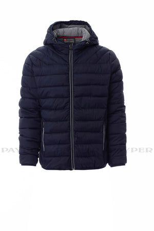 Piumino da uomo con cappuccio, zip 5mm in plastica con cursore in metallo, fine bordino ai polsi e in vita, due tasche esterne. Interno: imbottito di poliestere effetto piuma, due tasche.