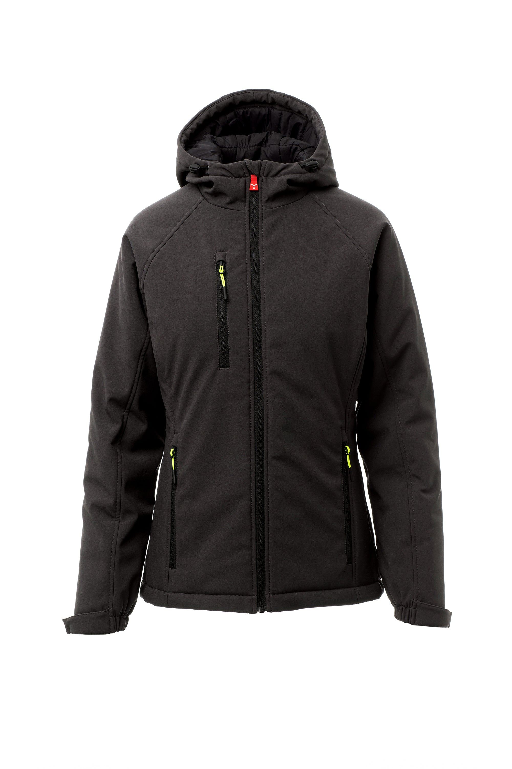 WP 8000 mm H₂O, WVT 5000 g/m² 24h. Soft-shell imbottito da donna, chiusura tramite zip con cursore in metallo "semi-auto lock" e tiretto personalizzato. Cappuccio fisso con coulisse regolabile. Polsini elasticizzati, regolabili con velcro. Due tasche laterali e una tasca al petto, chiuse con zip. Tiretti fluorescenti. Due tasche interne, una sagomata con zip e una porta tablet chiusa con velcro. Fondo regolabile con stopper personalizzati.