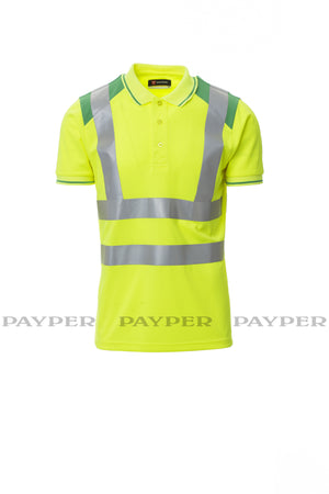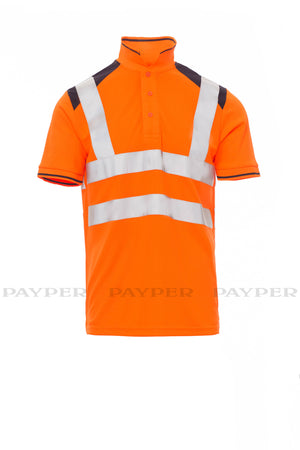 Polo da uomo a maniche corte, bicolore, ad alta visibilità con strisce riflettenti, con tre bottoni coordinati effetto madreperla, colletto e bordo manica a costine sottili a contrasto, spacchetti laterali, cuciture nascoste sul colletto.