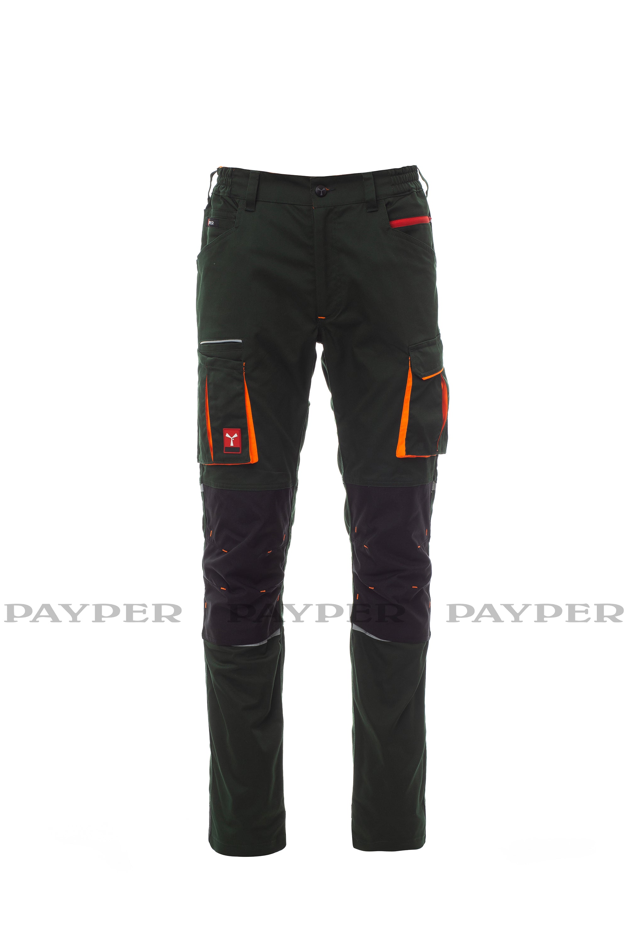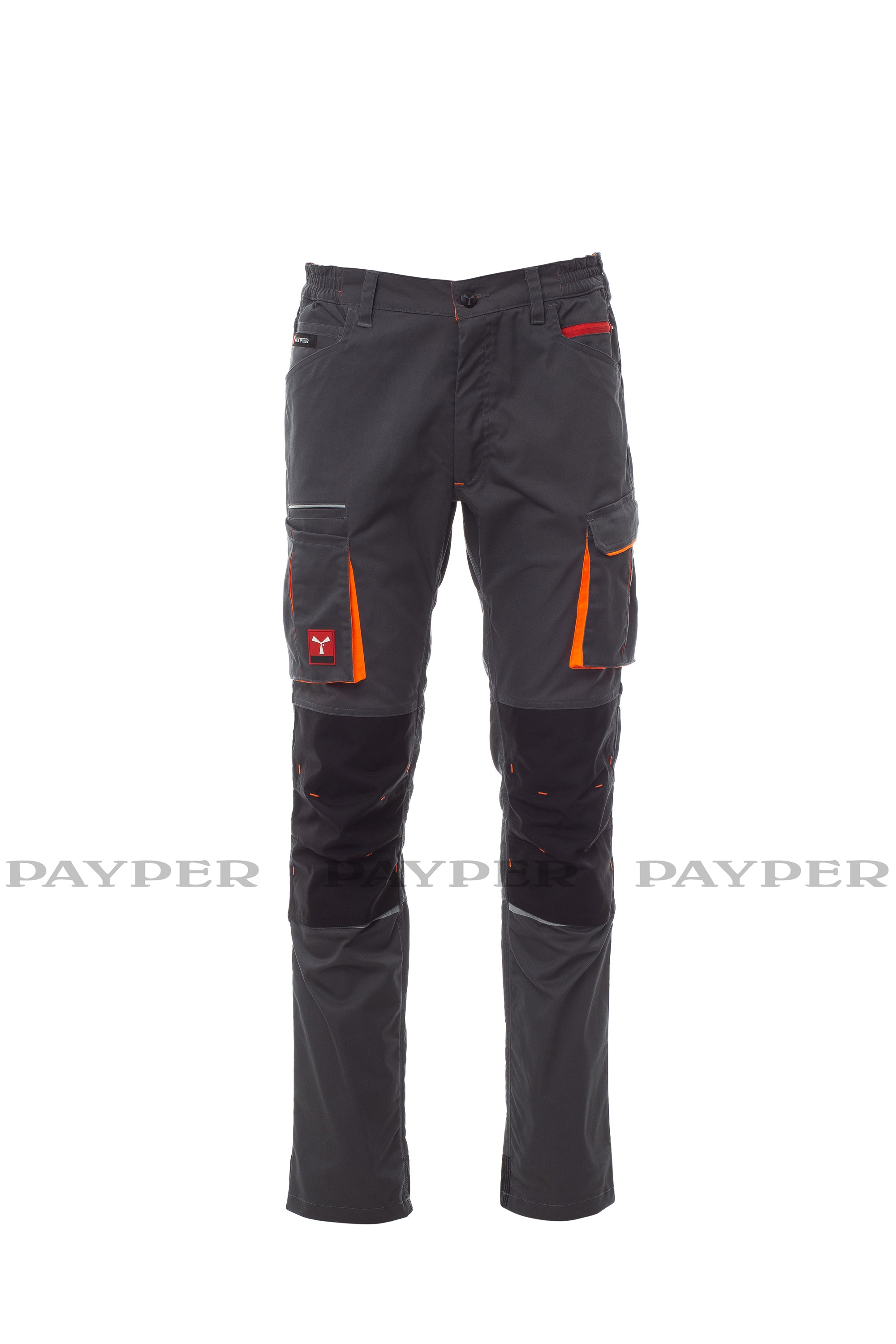 Pantalone unisex, elasticizzato, multistagione, con elastici laterali e passanti in vita, chiusura con zip e bottone personalizzato. Sul davanti ha due tasche sagomate, un taschino portamonete a destra, un taschino di sicurezza chiuso con zip a sinistra. Sul fronte della gamba sinistra presenta una tasca con soffietto, patta con chiusura a strappo e portabadge. Sul fronte della gamba destra sono presenti: un taschino porta telefono con bordo retroriflettente e una tasca con soffietto. Entrambe le gambe sono dotate di porta ginocchiere, in Nylon Oxford 500D, in tessuto a contrasto, con apertura dal basso e inserti retroriflettenti che segnalano l'apertura. Sul retro sono presenti: una tasca con patta e chiusura a strappo, una tasca portametro (gamba destra); una tasca aperta con due bande retroriflettenti (gamba sinistra); inserti retroriflettenti all'altezza delle ginocchia e battitacco in tessuto a contrasto per entrambe le gambe. Cuciture a tre aghi su cavallo, interno ed esterno gamba. Travette di rinforzo a contrasto in vari punti. Le taglie (italiane) centrali 48-50-52 hanno una gamba interna regolare di 82 cm.