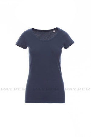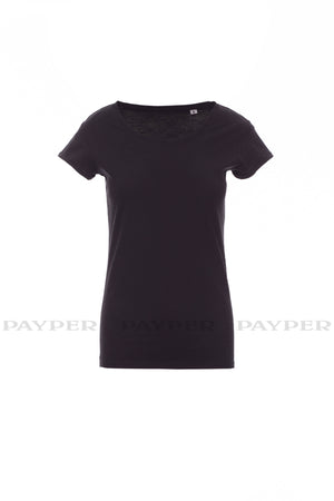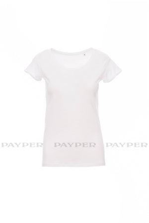 T-shirt sfiancata da donna manica corta con girocollo ampio, colletto basso misto spandex da 1.0 cm, spalle con cucitura doppia interna, maniche finite con fine risvolto a taglio vivo, cucita lateralmente. Neutra senza etichetta.