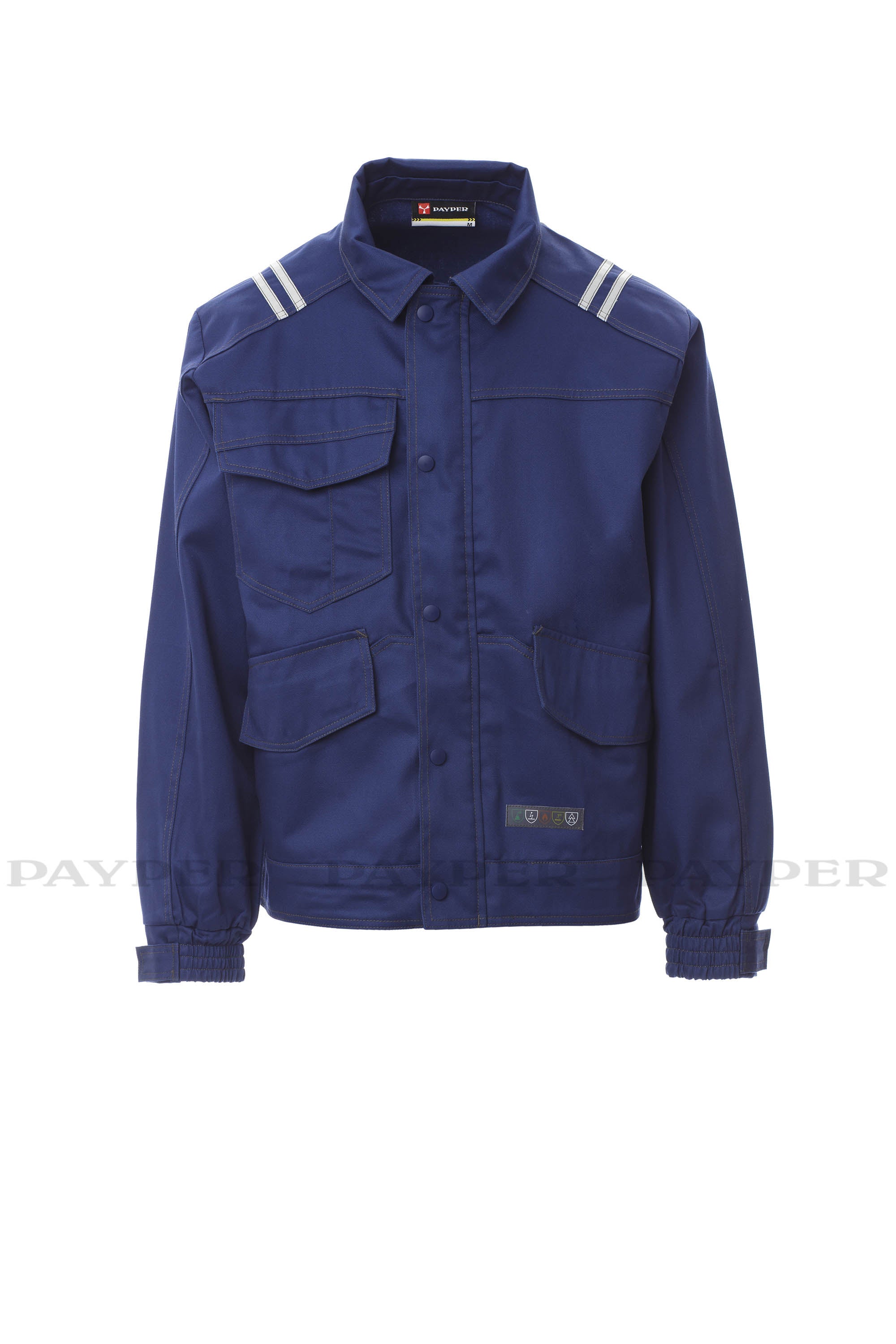 Giacca in denim di cotone antistatico, antiacido, ignifugo e resistente all'arco elettrico, adatta per saldatori, con doppie cuciture rinforzate a contrasto su maniche, fianchi e schiena. Due ampie tasche in vita e una tasca sul petto destra con portapenne, tutte con patta e chiusura in velcro. Schiena aderente regolabile in velcro per una migliore copertura, maniche aderenti con polsini elasticizzati e chiusure in velcro per ulteriori regolazioni. Cerniera frontale con patta e bottoni automatici. Strisce 3M retroriflettenti su spalle e parte bassa della schiena. Portabadge in plastica staccabile.