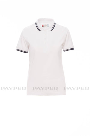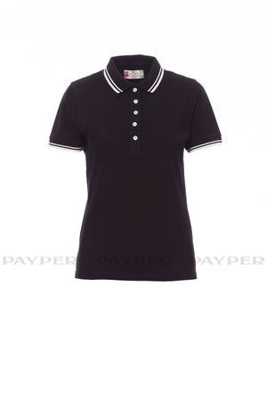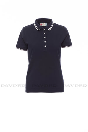 Polo donna sfiancata manica corta a cinque bottoni bianchi, collo e bordo manica con fine profilo a contrasto, colletto e bordo manica a costine, spacchetti laterali con cucitura di rinforzo, cuciture del collo coperte, nastro di rinforzo laterale, cuciture stretch, rinforzo sagomato retro collo.