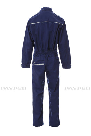 Tuta antistatica, antiacido, ignifuga e resistente all'arco elettrico, adatta per saldatori. Cerniera frontale con doppio cursore coperta da patta e chiusura in velcro, maniche aderenti con polsini elasticizzati e chiusure in velcro per ulteriori regolazioni. Elastico in vita sul retro e tassello per una maggiore facilità di movimento. Doppie cuciture rinforzate a contrasto su maniche, fianchi e schiena. Due ampie tasche in vita, una tasca sul petto destra con portapenne e due tasche posteriori, tutte con patta e chiusura in velcro. Strisce 3M retroriflettenti su spalle, carré e tasca posteriore. Portabadge in plastica staccabile.