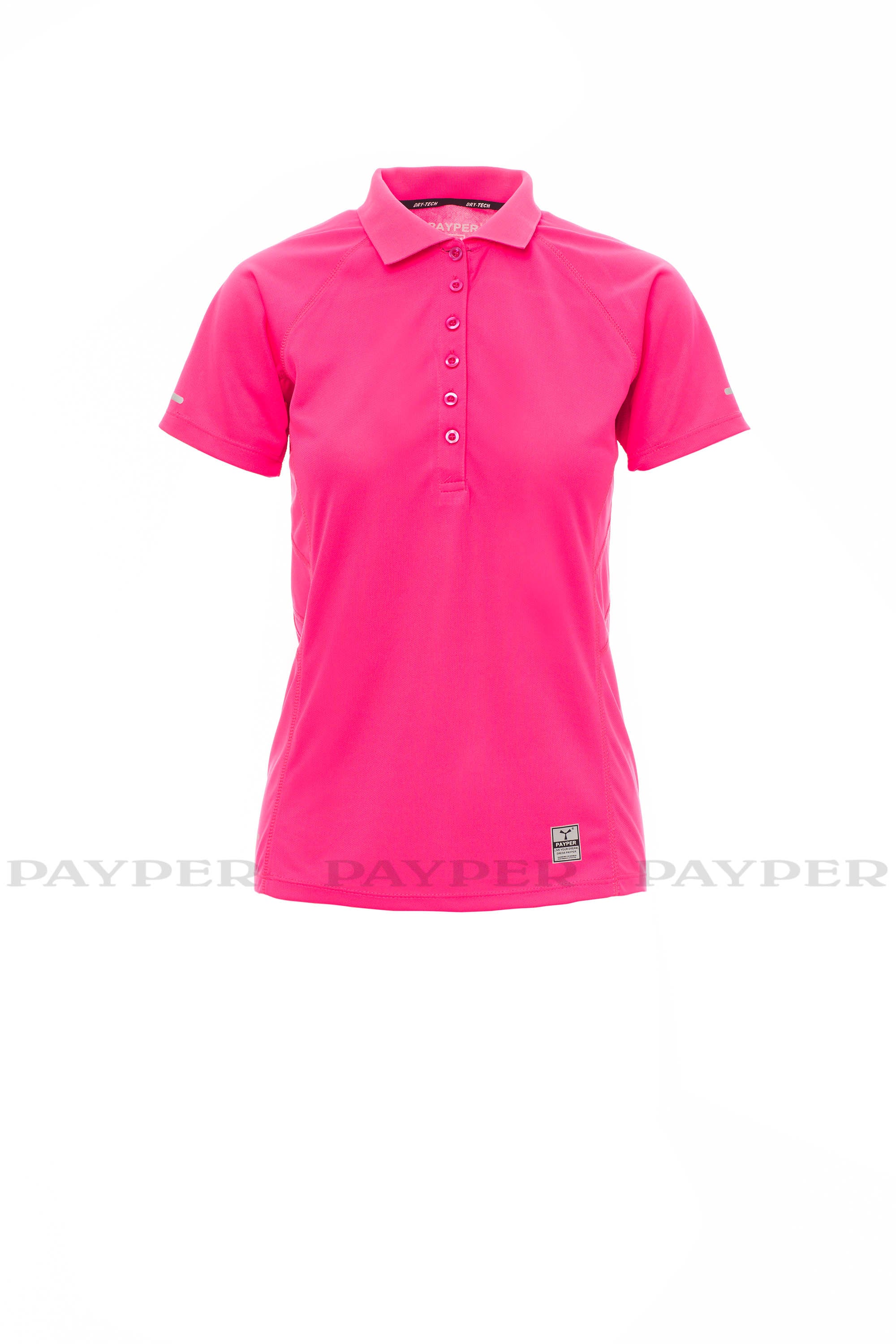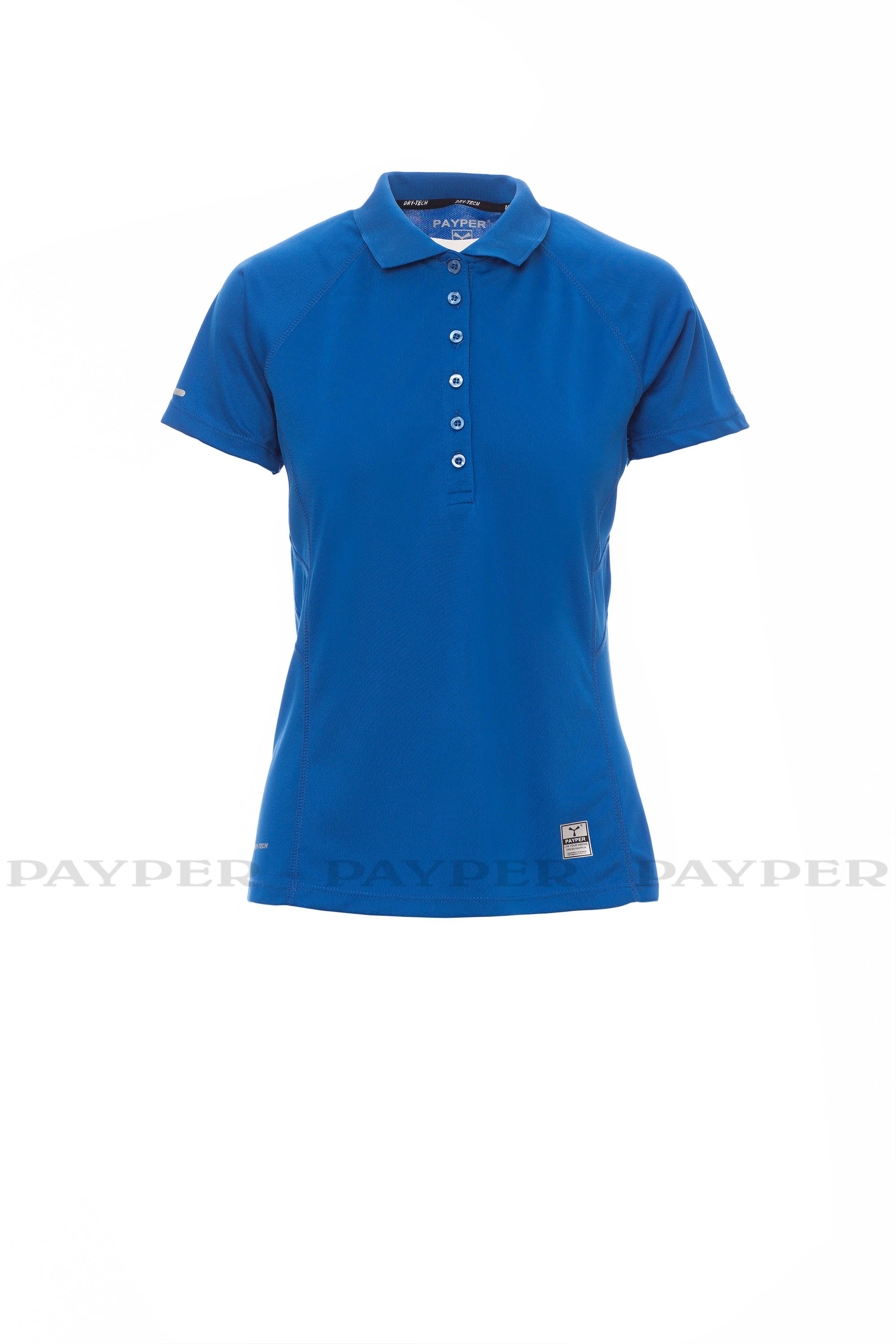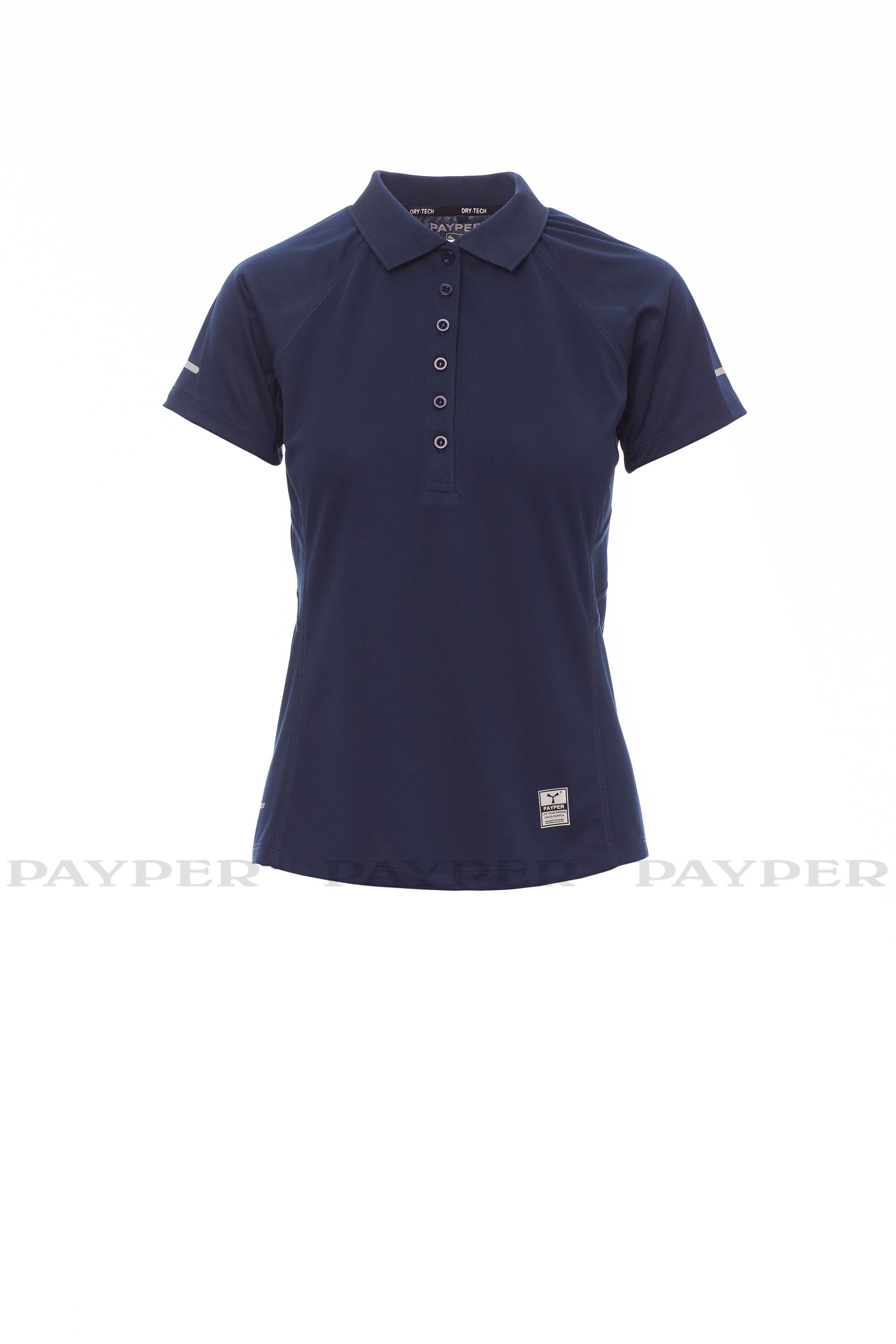 Polo tecnica-sportiva sfiancata da donna manica corta a sei bottoni in tinta, manica raglan, doppia cucitura laterale per una migliore vestibilità, fondo sagomato e più lungo sul retro, inserto riflettente alla maniche e retro collo, nastratura del collo a contrasto, etichetta transfer.