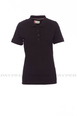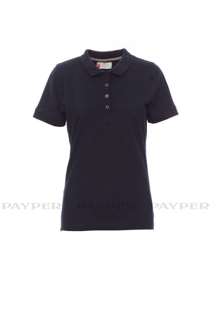 Polo sfiancata da donna a manica corta con 4 bottoni in tinta effetto perlato, colletto e bordo manica a costine, spacchetti laterali, cuciture del collo coperte con nastro a contrasto, cuciture stretch, nastro di rinforzo laterale, rinforzo sagomato retro collo.