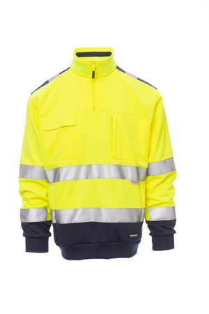 Felpa da uomo in alta visibilità con bande 3M, mezza zip in nylon con cursore in metallo, polsini e vita in costina elasticizzata, due tasche frontali con zip coperte, una tasca LOCK SYSTEM al petto con portabadge staccabile e richiudibile e una tasca con zip cuciture rinforzate