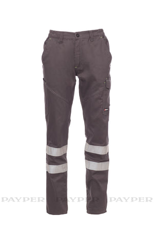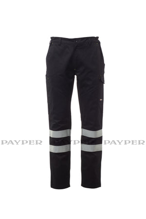Pantalone unisex, multistagione, con bande riflettenti in cat.1, elastici laterali e passanti in vita, chiusura con zip e bottone in plastica, due tasche anteriori a taglio classico, una tasca laterale LOCK SYSTEM, un porta metro, due tasche posteriori una aperta e una con patta e velcro, inserti ed impuntare a contrasto, bande reflex su tasca posteriore, cuciture triple. Impunture e cuciture in tono, con travette in contrasto giallo fluo, per il colore Total Black.