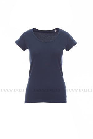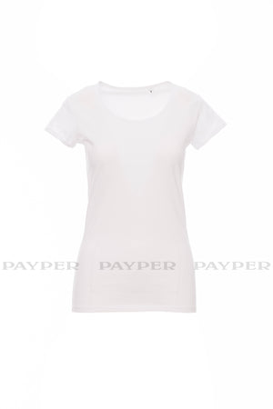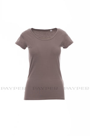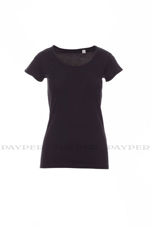 T-shirt manica corta sfiancata da donna con girocollo leggermente ampio, colletto con bordino fine, maniche finite con fine risvolto a taglio vivo, cucita lateralmente. Neutra senza etichetta.